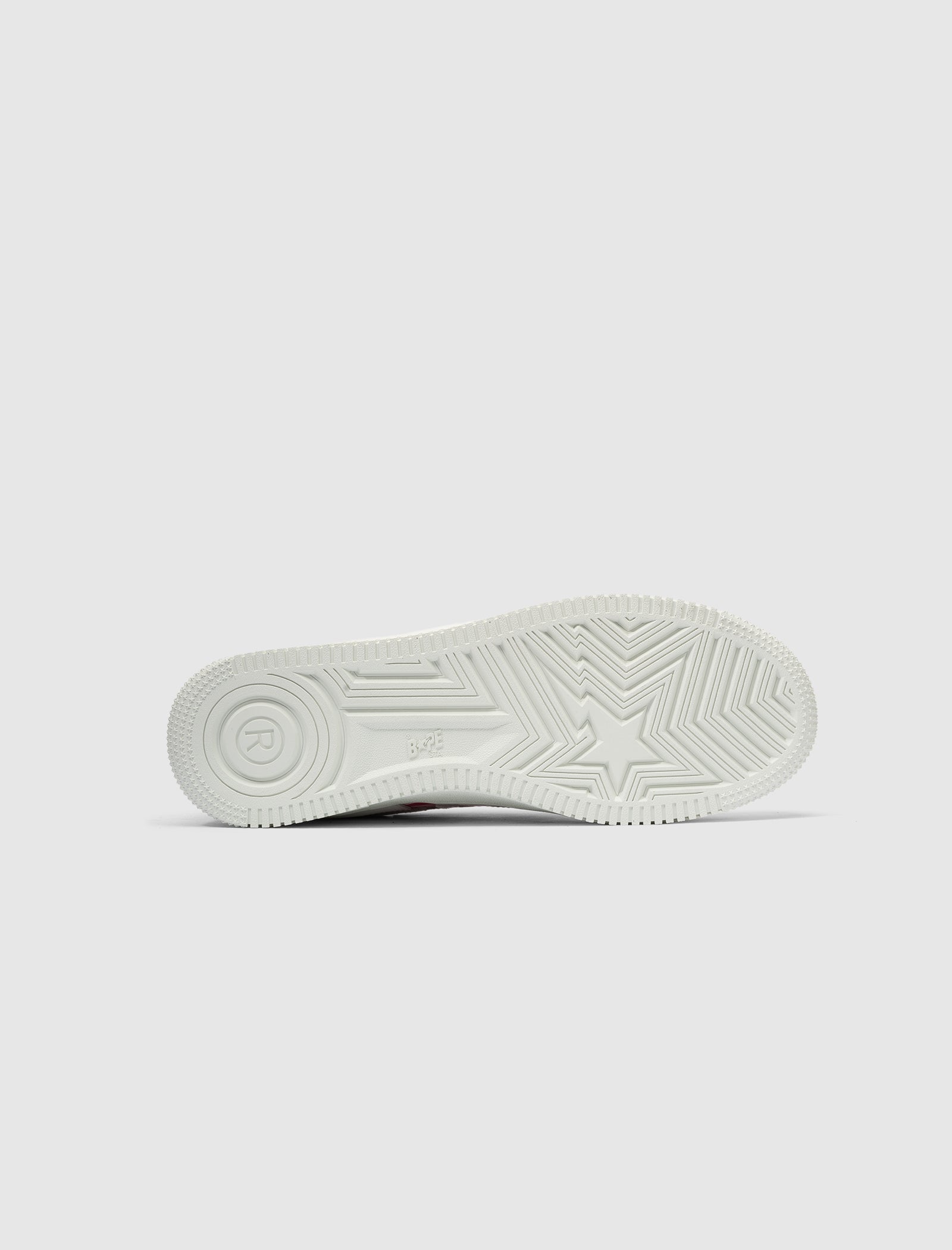 Low top sneakers. Leather upper. Perforated toe box. Leather overlays around the toe, eyelet panels, and heel counter. Leather logo overlay on the heel with a stamped logo. Leather logo motif shaped patches on the side panels. Front lacing with graphic patterns all throughout. Logo motif shaped lace dubrae on the bottom lace. Rubber midsole. Rubber outsole.