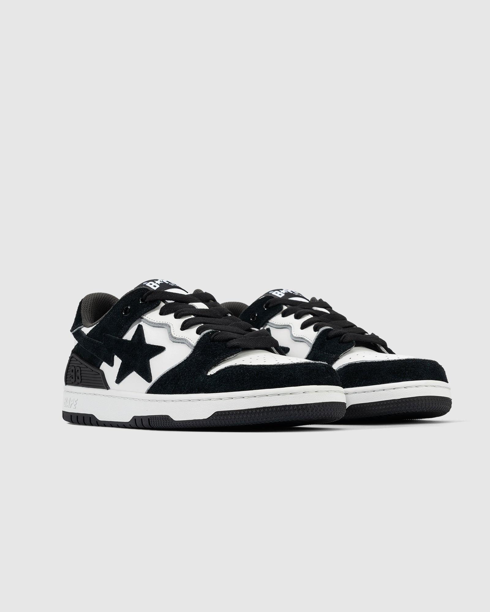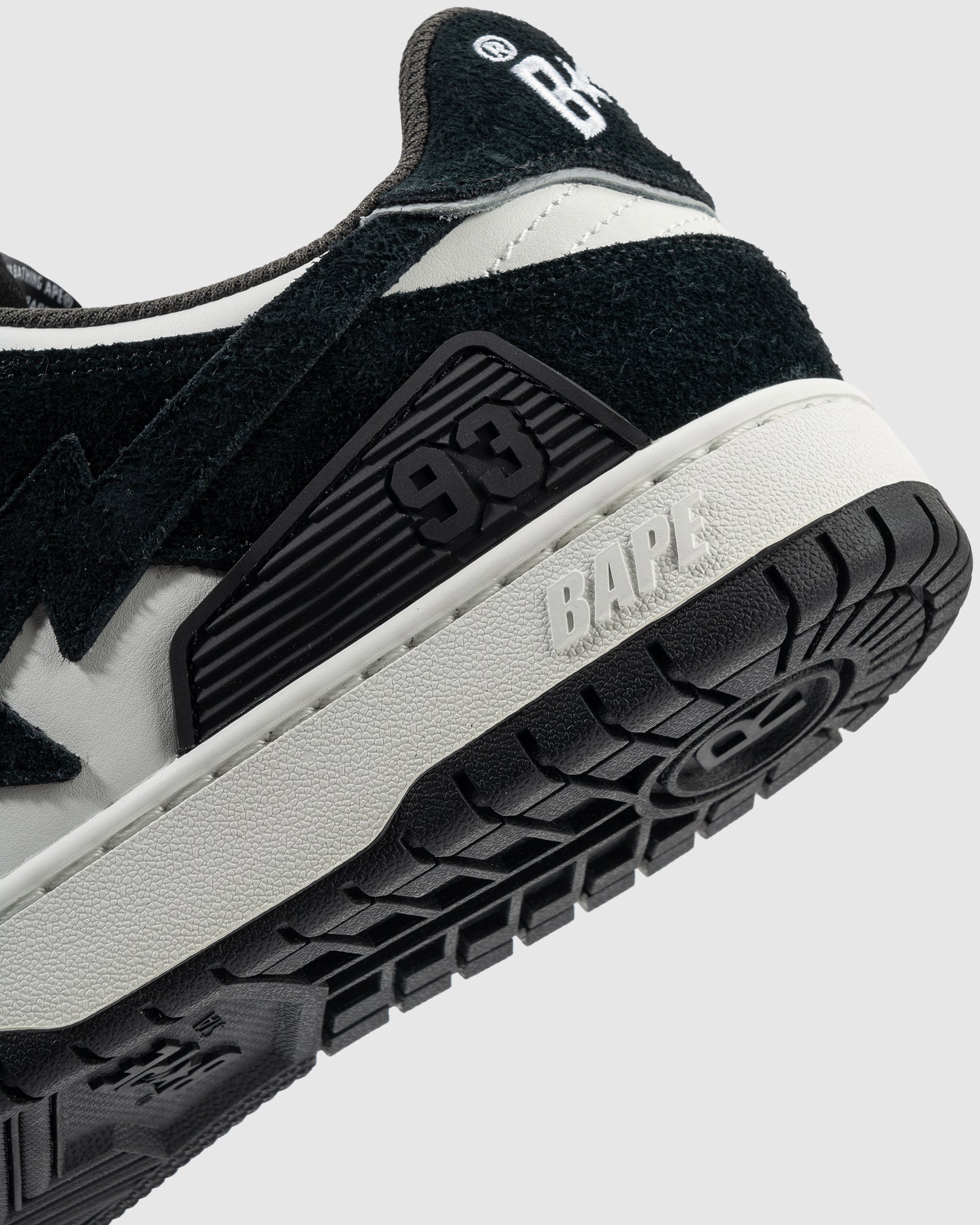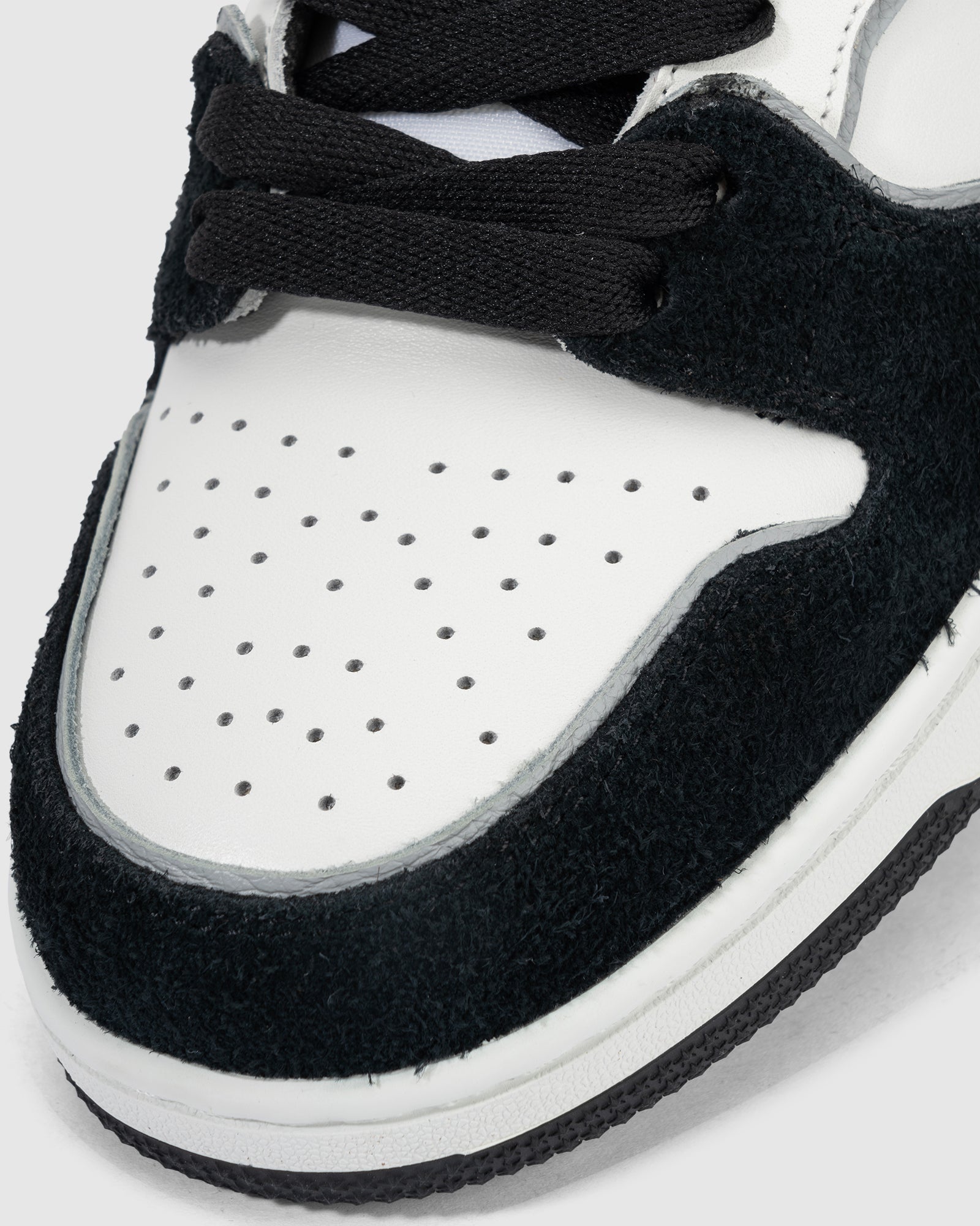 Low top sneakers. Suede overlays around the toe. eyelet panels. and heel counter. Perforated leather toe box. Leather side panels. and collar. Suede logos stitched on the side panels. Suede overlay on the back of the collar with an embroidered logo. Embroidered logo on the Front lacing. Front lacing. Synthetic insert on the outer heel. Rubber midsole. Rubber outsole.